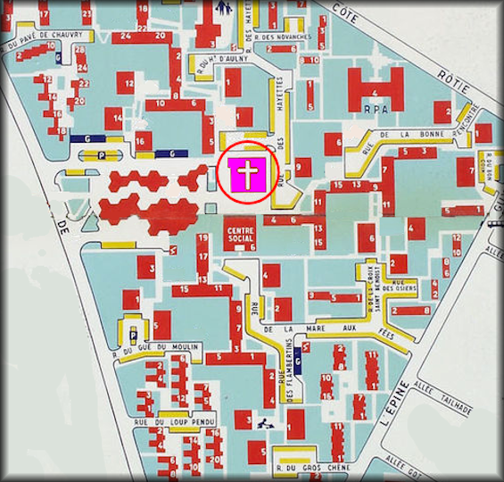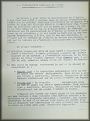 Il nous fut proposé par la caisse des dépôts qui avait primitivement préfinancé le projet de l’église. Elle s’est ensuite récusée. Il eut alors été difficile et onéreux de changer de Maître d’œuvre. C’est M. Saubot, l’architecte de l’ensemble de l’Épine-Guyon qui construira l’édifice. Ce sera sa deuxième église.