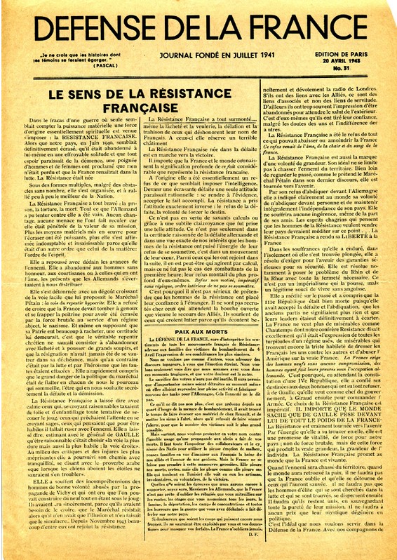 17 mai 1943, Un exemplaire du numéro 31 de "la Défense de la France est envoyé au commandant de la gendarmerie de Franconville.